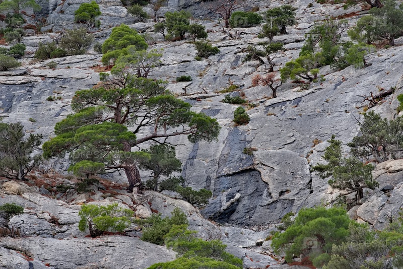 Вид деревьев и кустарников, растущих на очень крутых и гладких скалах на побережье Черного моря недалеко от города Судак