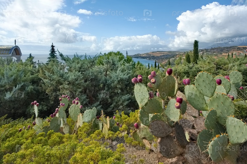 Пункция кактуса на скалистом берегу Черного моря возле деревни Малореченское