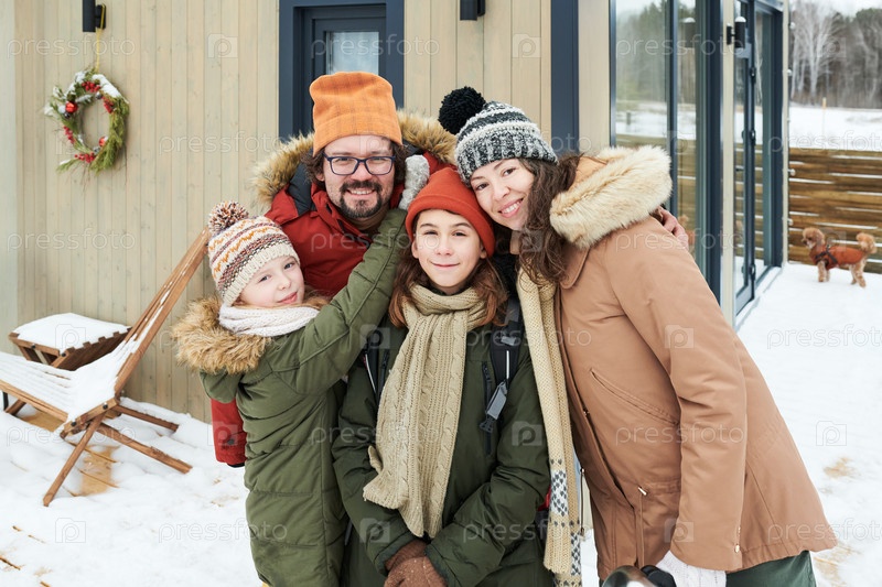 Семья улыбается на открытом воздухе во время зимних каникул Отдых в снегу