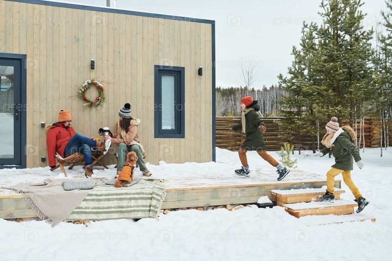 Семья проводит зимний день на свежем воздухе с детьми и собакой