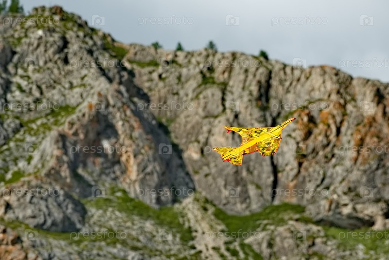 Юг Западной Сибири, Алтайские горы.Поднявшись в воздушном змее в форме самолета на фоне гор Алтая