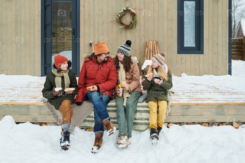 Семья наслаждается зимним пикником на открытом воздухе вместе в снежной обстановке