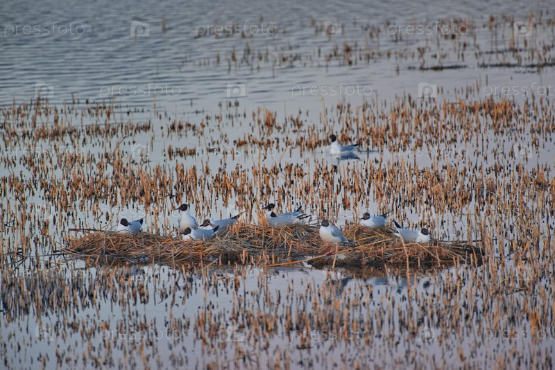 Небольшая колония речных чайков на теплых гнездах на осеннем переросшем тростниковом озере в окрестностях деревни Кош-Агач