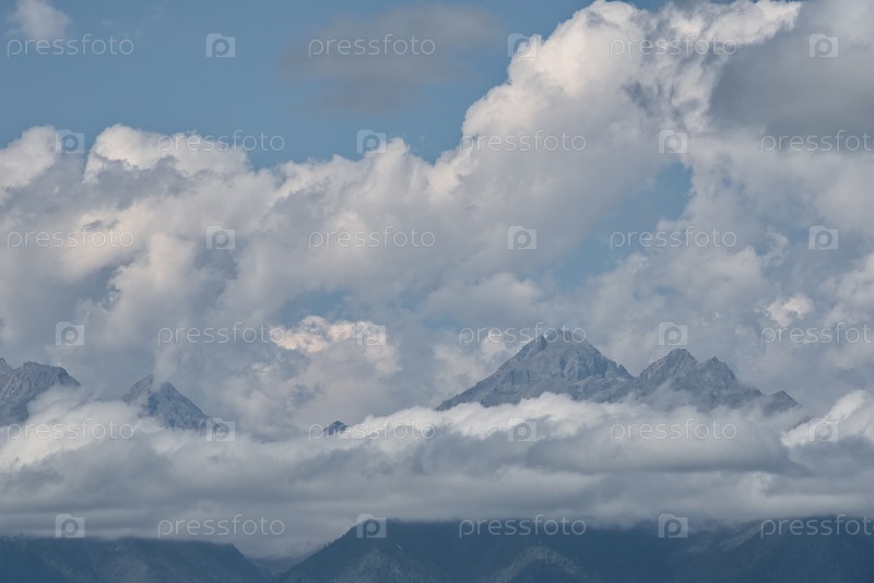 Живописный вид на вершины горного хребта Восточных Саянов, тонущих в тумане и кумулярных облаках, открывается из долины реки Иркут