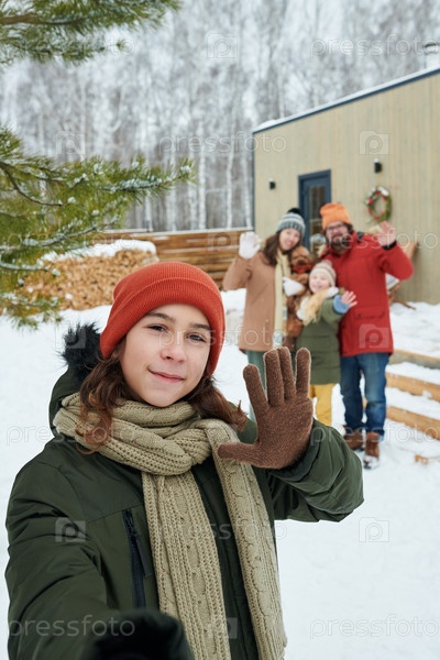 Девушка-подросток делает селфи с семьей, размахивая на улице зимой