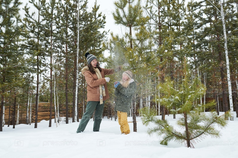 Женщина и ребенок играют вместе в снежном сосновом лесу на открытом воздухе