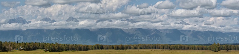 Живописный вид на вершины горного хребта Восточных Саянов, тонущих в тумане и кумулярных облаках, открывается из долины реки Иркут