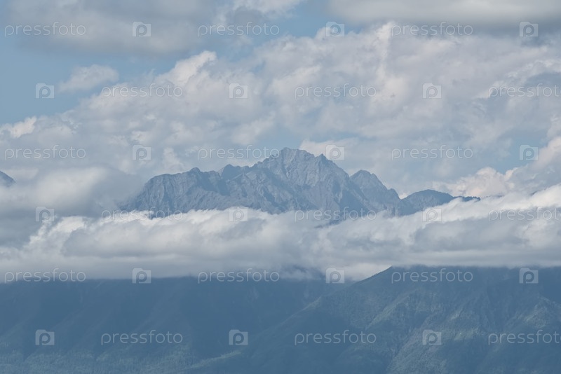 Живописный вид на вершины горного хребта Восточных Саянов, тонущих в тумане и кумулярных облаках, открывается из долины реки Иркут