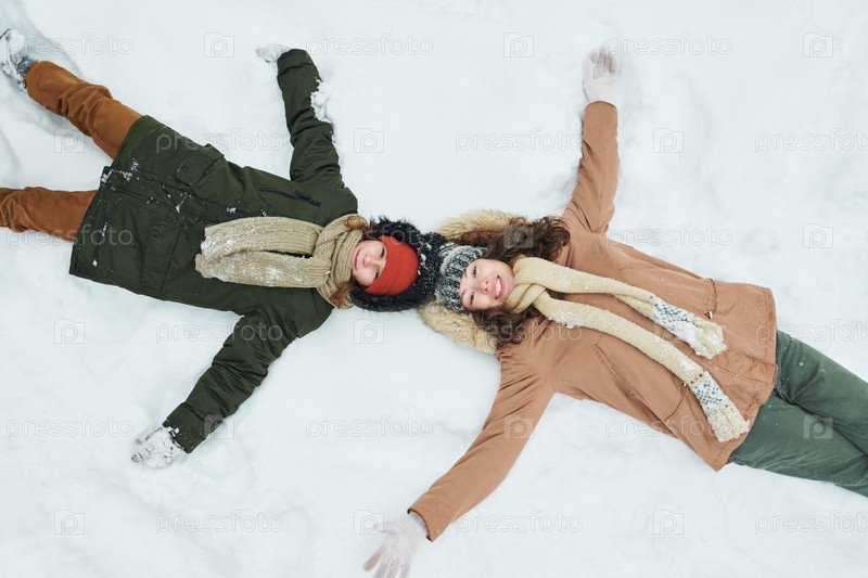 Мальчик-подросток и его мать лежат улыбаясь в снегу