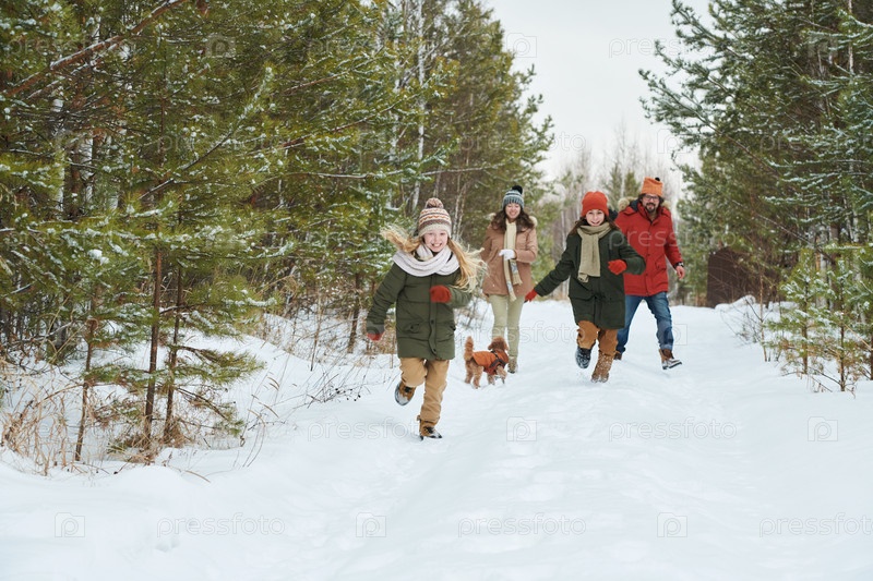 Семья с детьми бегает с собакой по тропинке в снежном лесу