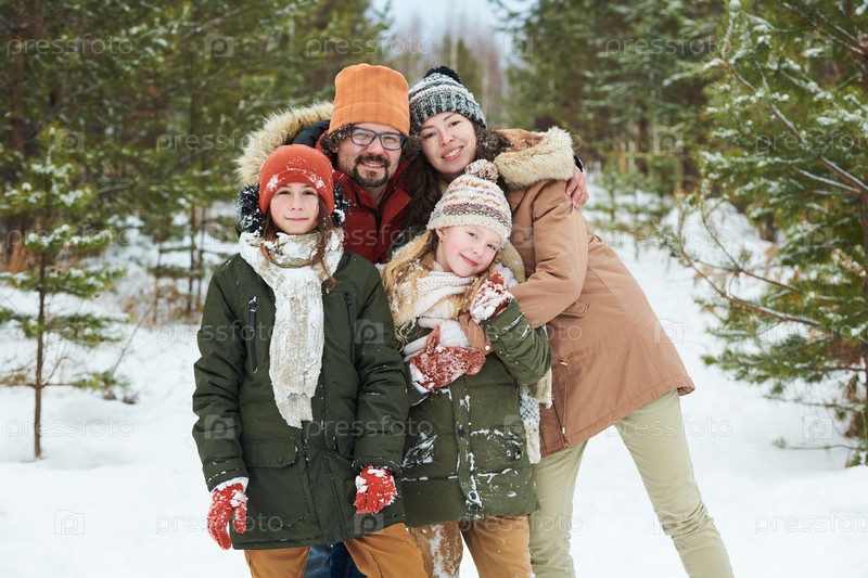 Семья обнимается на свежем воздухе наслаждаясь зимним лесом вместе улыбаются
