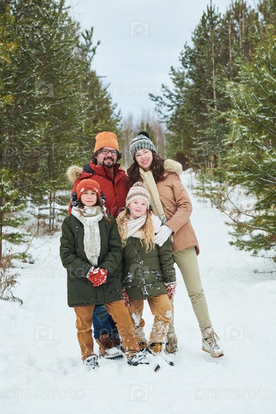 Портрет семьи, стоящей вместе и улыбающейся в снежном лесу