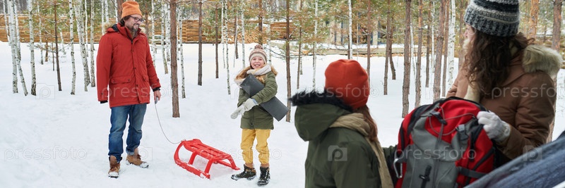 Отец смотрит, как улыбающийся ребенок тянет санки во время зимней экскурсии