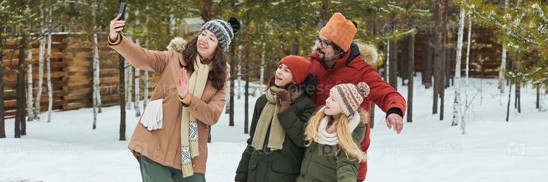 Семья делает селфи на свежем воздухе во время зимних каникул в снежном лесу
