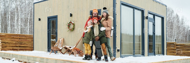 Семья стоит вместе снаружи современного дома во время зимних каникул