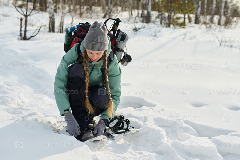 Молодая взрослая женщина корректирует снегоуборы во время походов в зимний лес