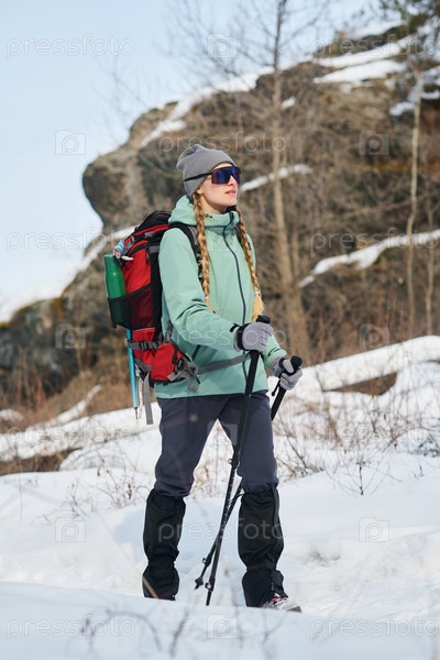 Молодая взрослая женщина ходит с рюкзаком в снежный зимний лес
