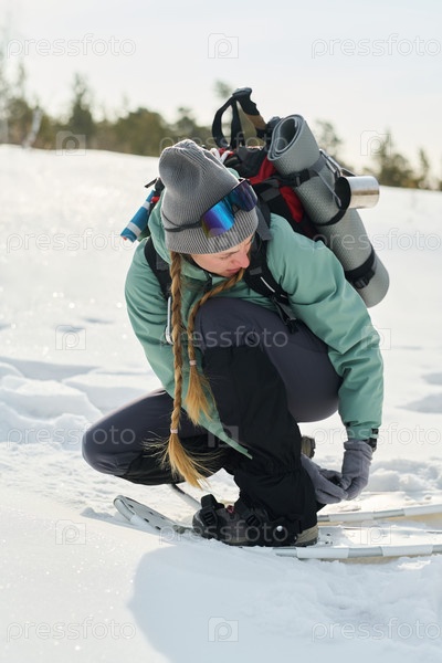Молодая взрослая женщина корректирует снегоуборы во время походов по снежному ландшафту
