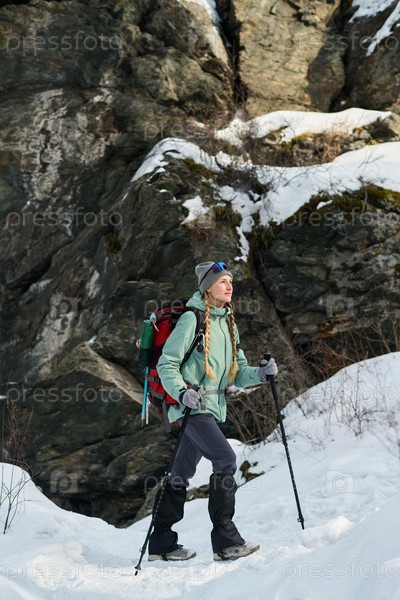 Молодая взрослая женщина путешествует с поляками рядом со снежными скалами
