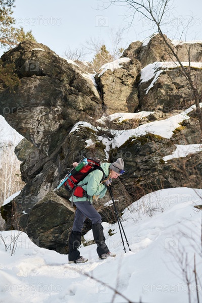 Женщина средних лет путешествует с рюкзаком по тропинке Снежного леса