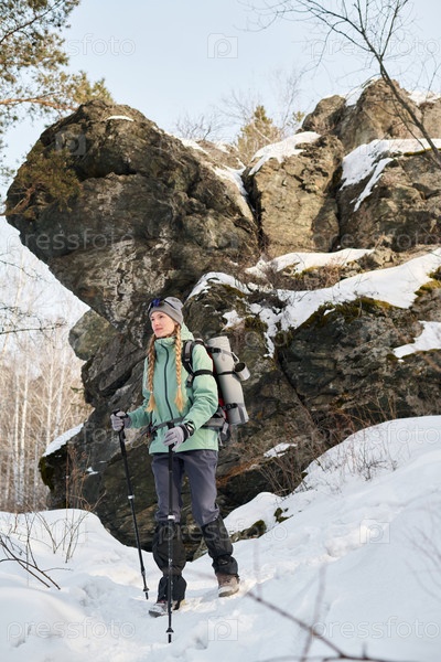 Молодая взрослая женщина путешествует рядом со снежным валуном зимой