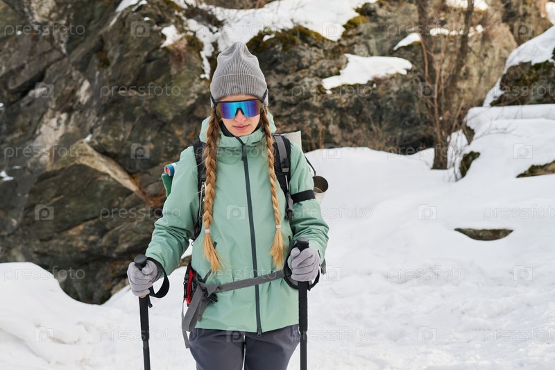 Молодая женщина ходит с поляками в снежном горном пейзаже