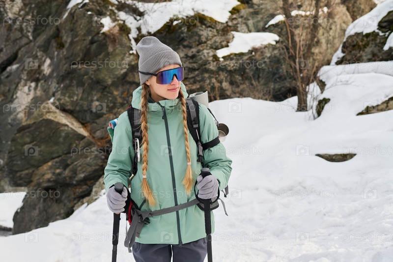 Молодая женщина путешествует по снежному горному ландшафту в зимний день