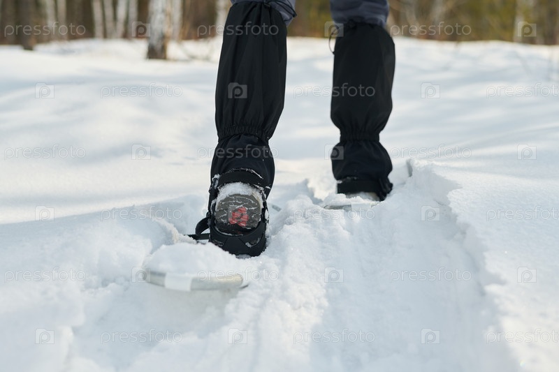 Молодой взрослый ходит по снегу со снегоуборочными ботинками в зимнем лесу