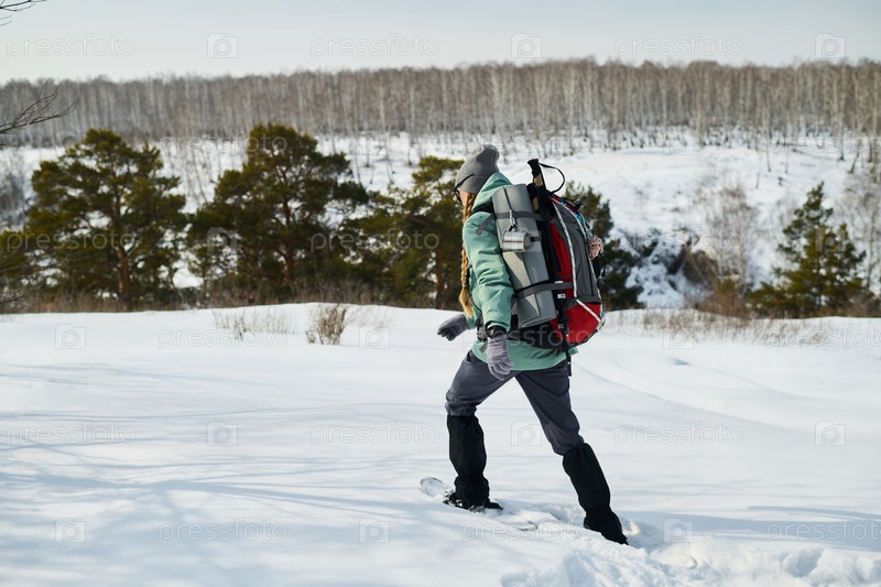 Молодая взрослая женщина путешествует по снежному лесу, неся рюкзак