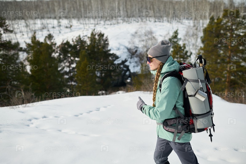 Молодая взрослая женщина путешествует вверх по снежному склону с рюкзаком