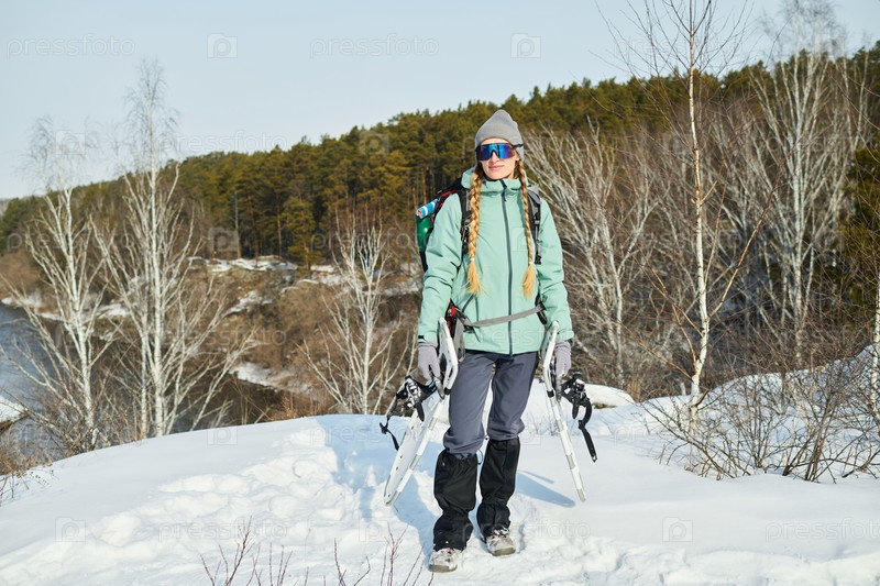 Молодая взрослая женщина, ходящая на снегоуборах в ландшафте зимнего леса