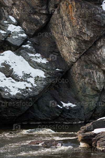 Скалистые скалы с таянием снега рядом с текущей рекой в начале весны