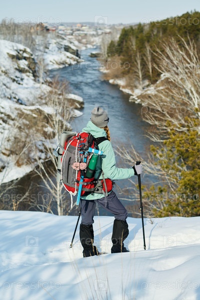 Молодая взрослая женщина, путешествующая с рюкзаком с видом на долину Снежной реки