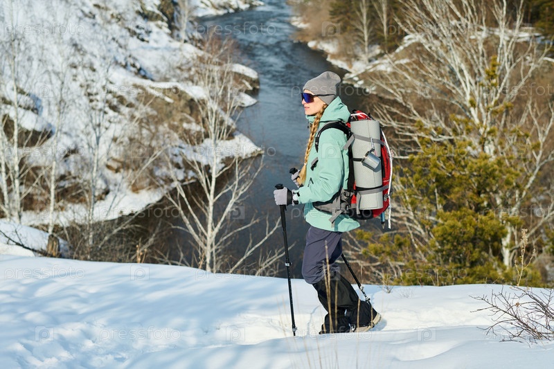 Молодая взрослая женщина путешествует с рюкзаком вдоль берега Снежной реки