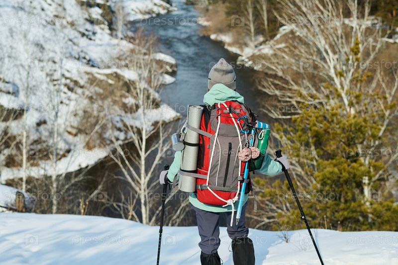 Молодая взрослая женщина путешествует с рюкзаком в снежном горном ландшафте