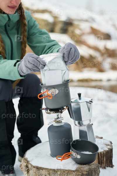 Молодая женщина готовит еду на свежем воздухе с помощью кемпинговой плиты в снежной природе