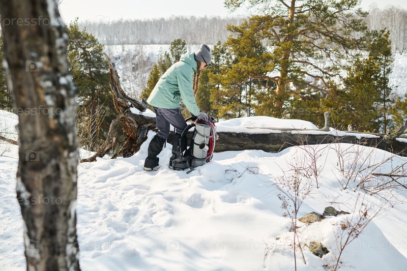 Молодая взрослая женщина собирает рюкзак во время зимней прогулки по лесу