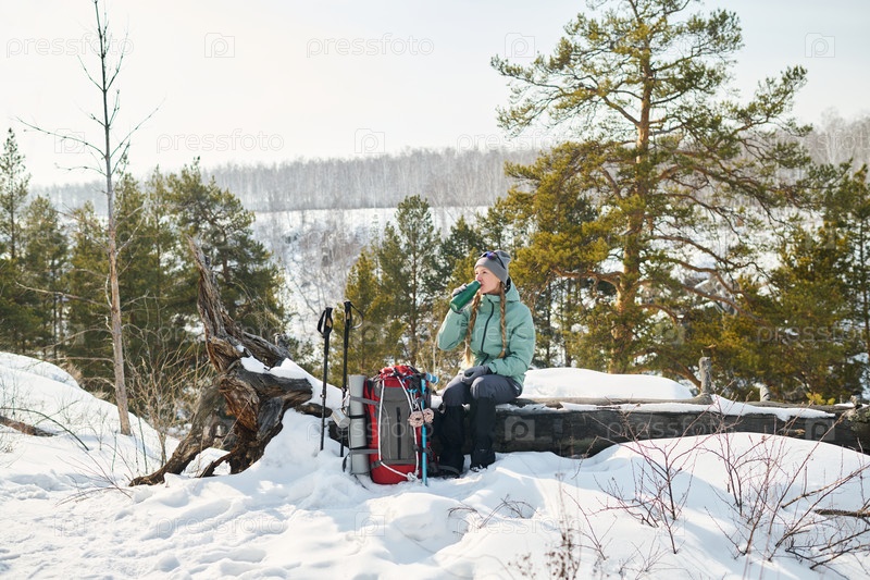 Молодая взрослая женщина отдыхает на снежном бревне, выпивая из термоса
