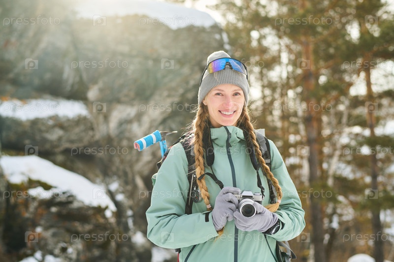 Портрет молодой взрослой женщины, улыбающейся в то время как она держит камеру на улице