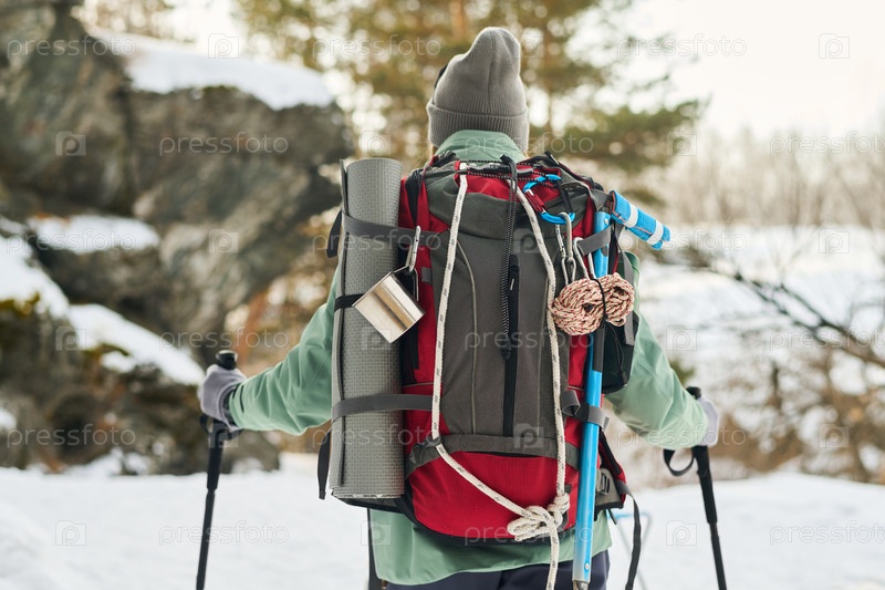 Мужчина средних лет ходит на природе с рюкзаком в снежном лесу