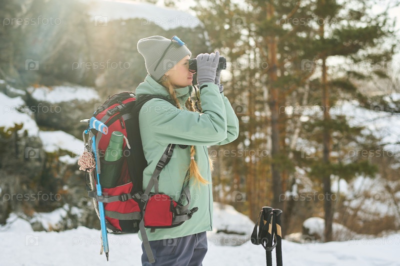 Молодая женщина ходит в снежный лес, используя бинокль для наблюдения