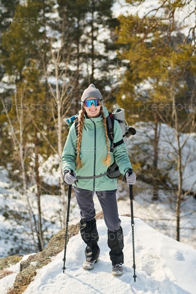Молодая взрослая женщина ходит в поход с трекинговыми поляками в снежном лесу
