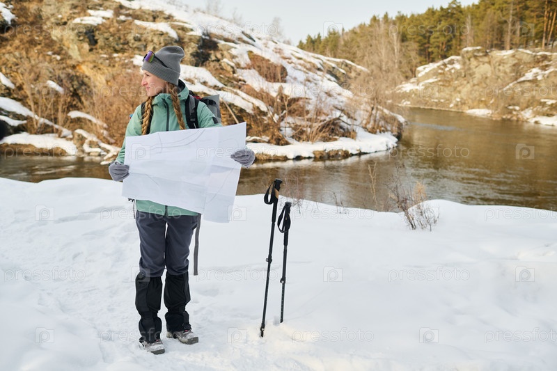 Молодая взрослая женщина, ориентирующаяся по снежному ландшафту с картой во время зимы