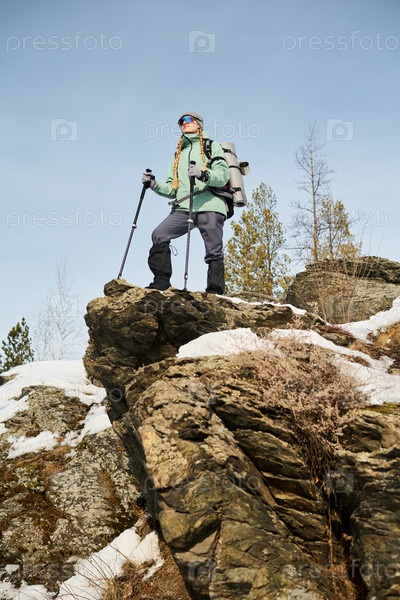 Молодая взрослая женщина, стоящая на скалистых обрывах, ходит в поход с треккинговыми столбами