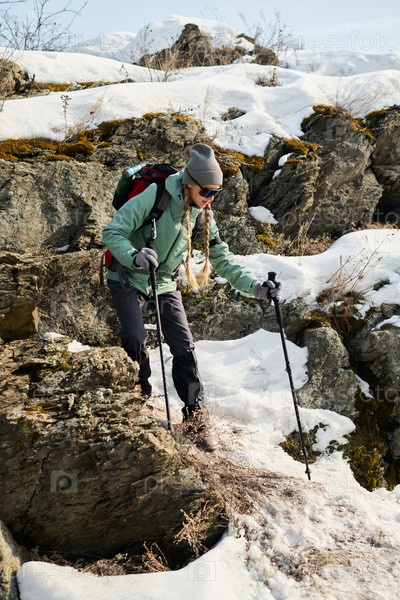 Молодая взрослая женщина ходит в поход с трекинговыми поляками на Снежной горной тропе