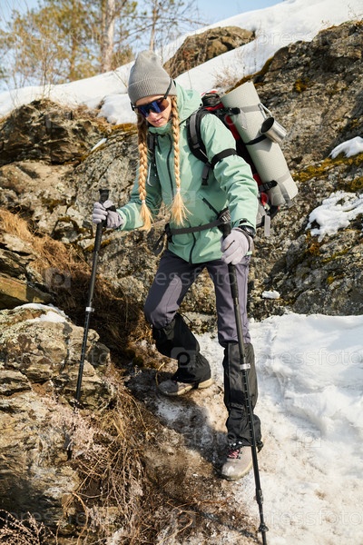 Молодая взрослая женщина путешествует по Скалистой Снежной тропе, неся рюкзак