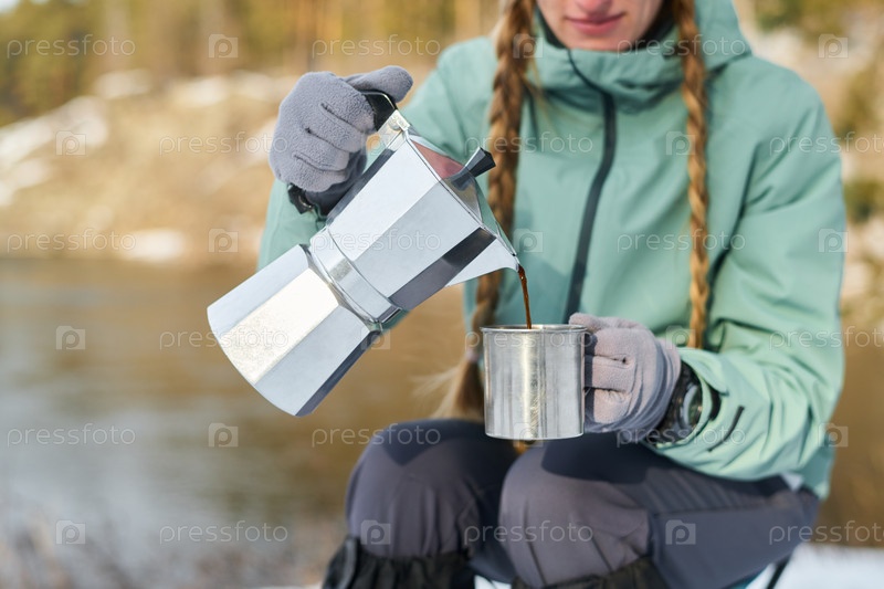 Молодая женщина наливает кофе на улице во время зимнего кемпинга