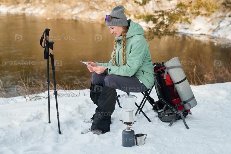 Молодая взрослая женщина улыбается, читая карту во время зимнего кемпинга