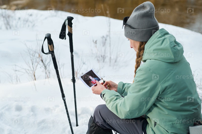 Молодая взрослая женщина сидит на улице и смотрит фотографию в снегу