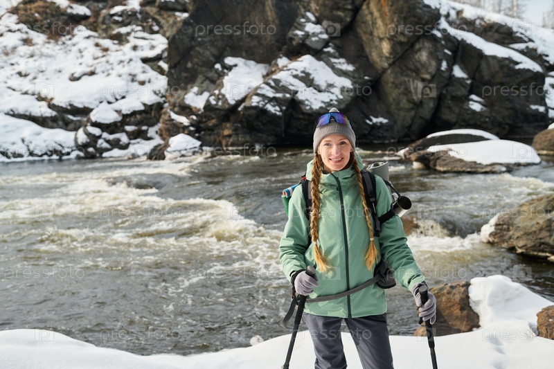 Портрет девочки-подростка, улыбающейся во время похода вблизи Снежной реки